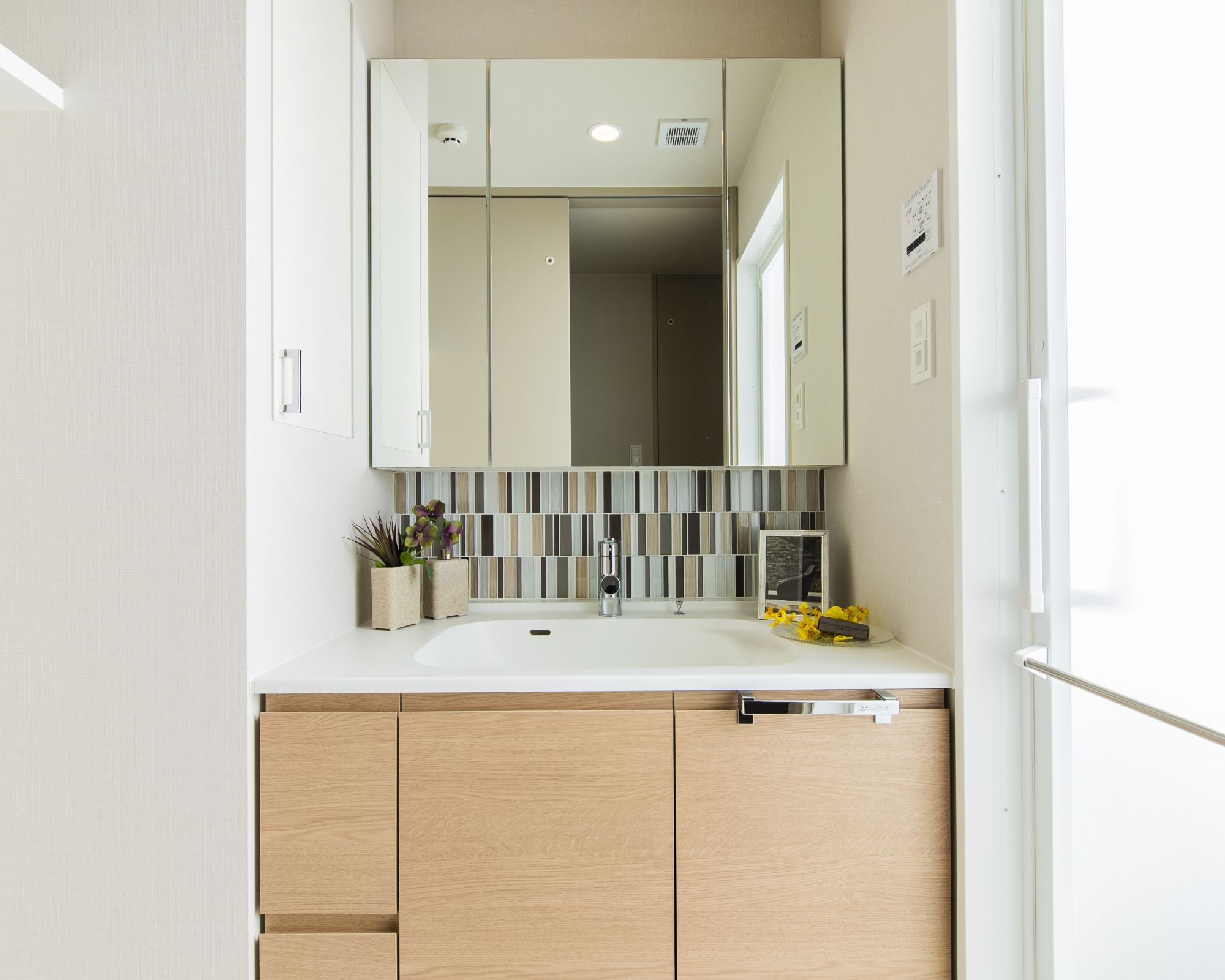 タオルや入浴剤などをストックしておけるリネン庫を設備。きちんと収納できる可動式の棚と扉付きのスペースが、空間をより広く清潔に見せます。