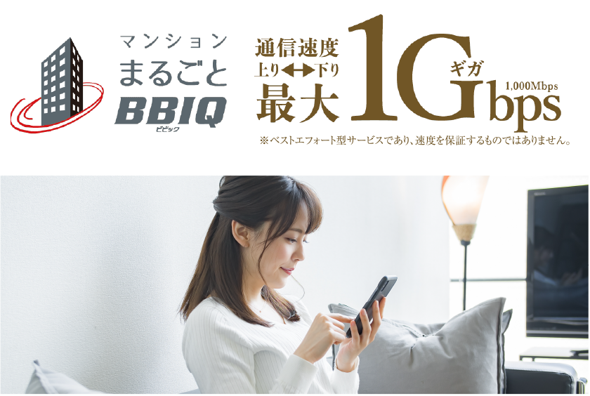 マンションまるごとBBIQとは、QTnetが提供するBBIQ光インターネットサービスを全戸に標準装備。各住戸が光ファイバー回線で、高速・高品質のインターネット環境を実現します。通信速度は各住戸最大1Gbpsで、高画質の動画視聴やWeb会議システムもスムーズに対応可能です。また、おトクな光電話、多チャンネル放送の光テレビなど、暮らしがより楽しく便利になる設備・サービスも満載です。