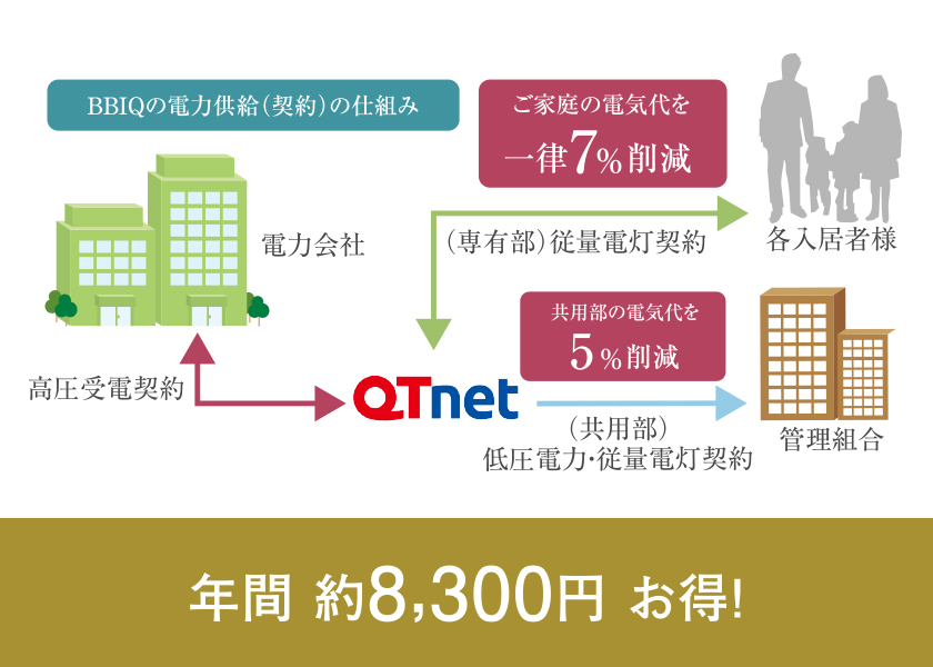 一括受電システム「BBIQ電力」とは、マンション一棟丸ごとの契約とすることで、単価の安い高圧電力契約とし、従来の地域電力会社と各入居者さまとの個別契約に比べて電気代を安くするサービスです。